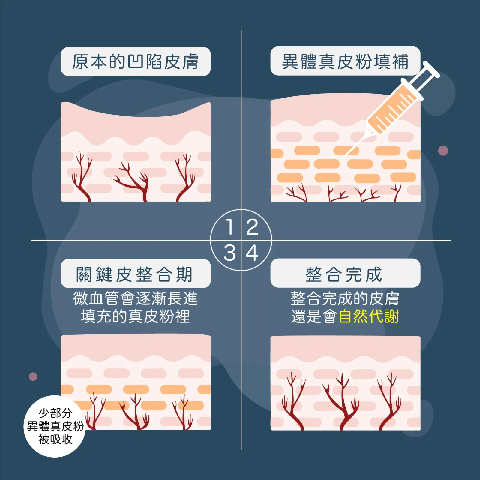 - 半永久階段: 存留下來的真皮粉會吸引自體血管與細胞長入,成為自體組織的一部分,許多案例顯示效果可維持 5 年以上。