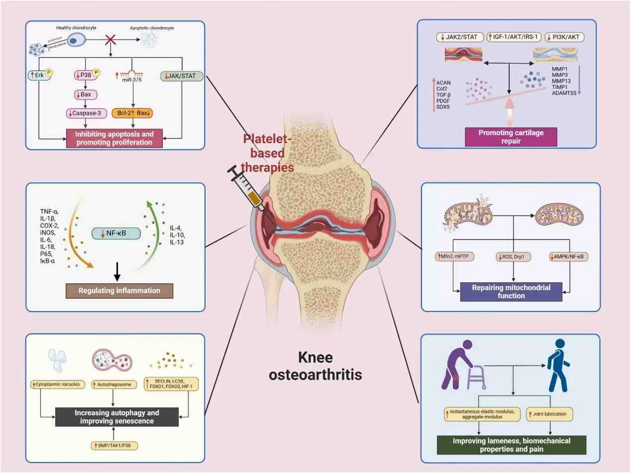 這是近年功能醫學的熱門發現。軟骨細胞的凋亡與「粒線體功能失衡」有關。血小板製劑可減少活性氧 (ROS) 造成的損傷,並透過 AMPK/NF-κB 訊號調控,保護軟骨細胞免受氧化壓力攻擊。 (參考文獻:Tissue Cell, 2022)