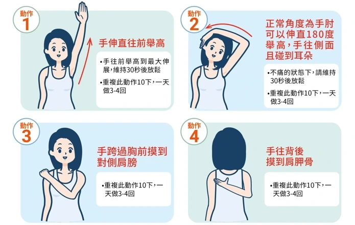 - 後伸摸背: 手往背後摸到肩胛骨,改善穿內衣或抓背的動作困擾。