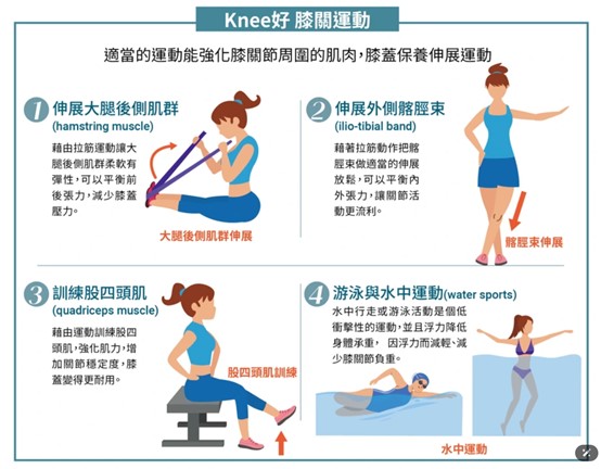 4. 水中行走或游泳-水中活動是低衝擊的運動,水的浮力可以減少膝關節的負擔,適合術後恢復期進行。