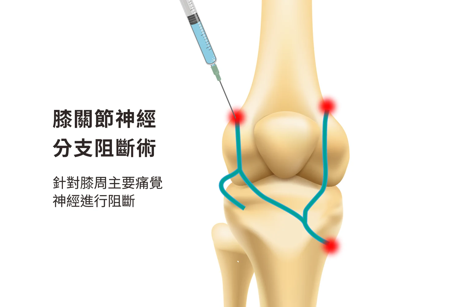 - 膝關節神經分支阻斷(Genicular Nerve Block):針對膝關節周圍的主要痛覺神經分布進行精準阻斷。