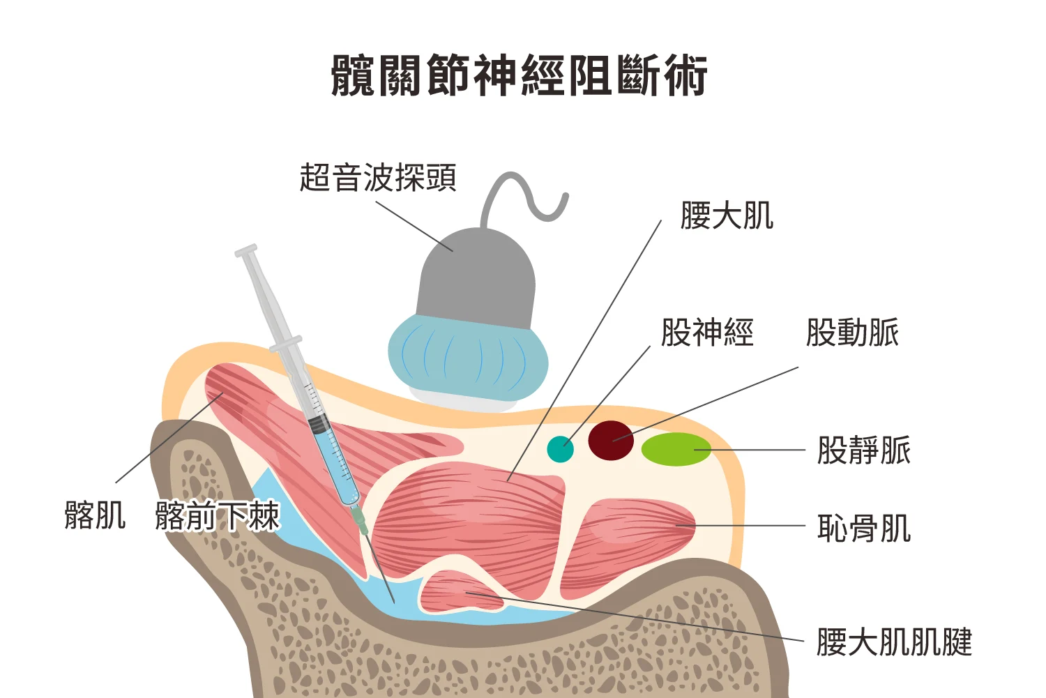 - 內收肌通道阻斷(Adductor Canal Block):阻斷隱神經,改善膝內側疼痛。